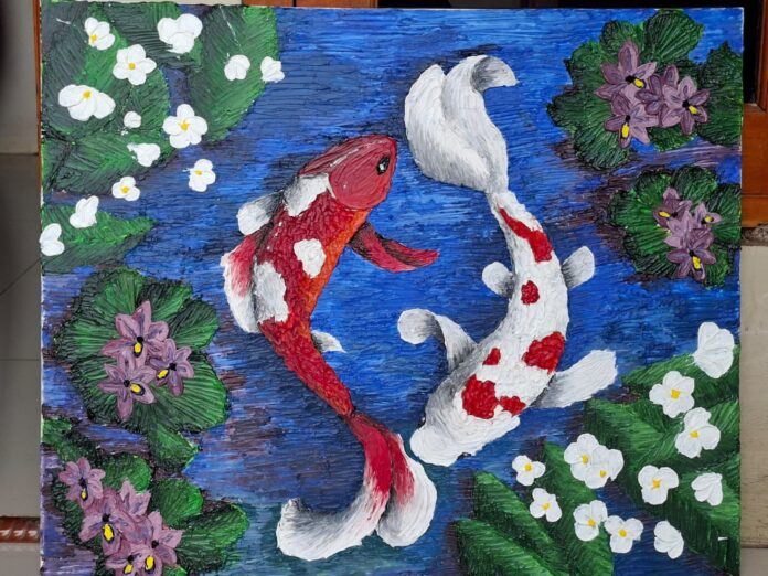 Lukisan bertema ikan Koi yang dinamis menjadi karya yang dilelang oleh Puput. Ikan Koi dalam karyanya ini bukan sekadar objek estetika, melainkan simbol keteguhan hati dan harapan semangat yang ingin ia bagikan kepada warga Pandeglang yang sedang terbaring sakit di rumah sakit maupun di rumah.