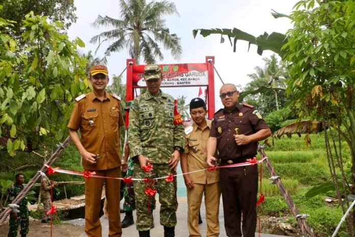 KATAWAY.CO.ID – Komandan Komando Distrik Militer (Dandim) 0602/Serang, Kolonel Artileri Medan (Arm) Oke Kristiyanto, Sekretaris Daerah (Sekda) Kabupaten Serang, Zaldi Dhuhana dan Kepala Kejaksaan Negeri (Kajari) Serang IG. Punia Atmaja NR meresmikan Jembatan Garuda di Kampung Mayak, Desa Baros, Kecamatan Baros pada Senin, 9 Maret 2026.